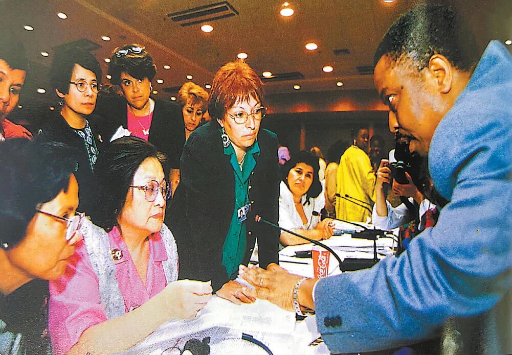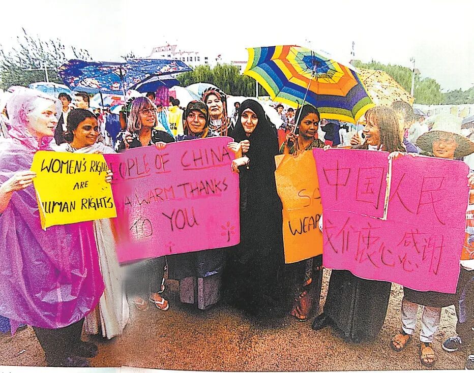 有中东、波黑和日本妇女的反战游行,打出“女人不要战争”的标语;有第三世界妇女对大国霸权主义和经济掠夺表示抗议,甚至喊“打倒美帝国主义”的口号;有韩国妇女代表的游行,要求日本政府就“二战”期间强迫韩国妇女当“慰安妇”道歉。